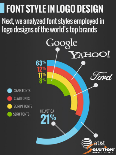Chữ trong thiết kế logo, font chữ phổ biến là loại sans font (font không chân). Ví dụ là logo at&t chiếm đến 63% logo với 100 thương hiệu nổi tiếng. Và ở trong đó thì bạn chiếm tới 21% là kiểu Helvetica, thấy font chữ giữ vị trí trung tâm khiến nhà thiết kế, người làm thương hiệu luôn sử dụng.