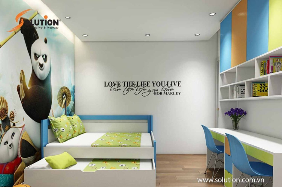 Hai bé trai bụ bẫm yêu thích bộ phim Kungfu Panda đã trở thành cảm hứng để chúng tôi sáng tạo ra phòng ngủ dành cho bé. Giảm thiểu tối đa các góc nhọn chính là xu hướng để chúng tôi bảo vệ những thiên thần hiếu động bé nhỏ. Dòng chữ trên tường của Bob Marley là lời hướng dẫn, động viên, cũng như một điểm tựa tinh thần để hai bé thoải mái sống cuộc sống bản thân lựa chọn.