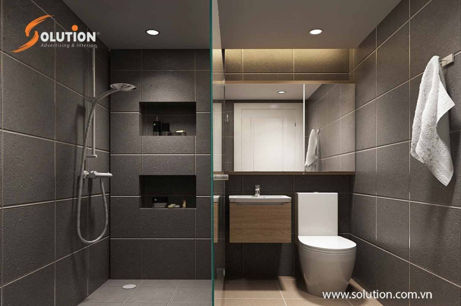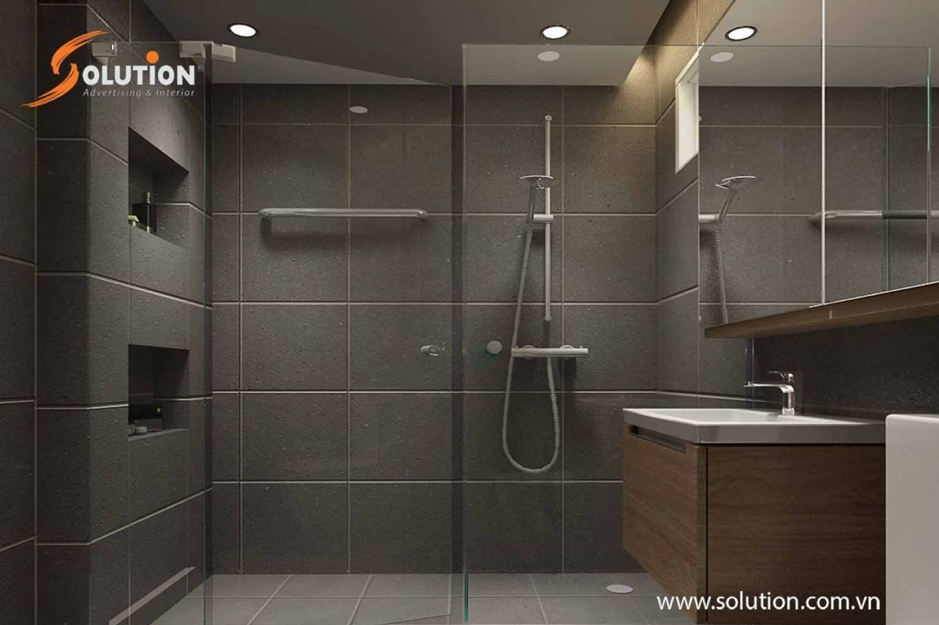 Phòng tắm không sử dụng bồn tắm tốn diện tích nhưng được thiết kế vách ngăn kính giữa 2 khu vực tắm và toilet giúp không gian rộng và thoáng rất nhiều.