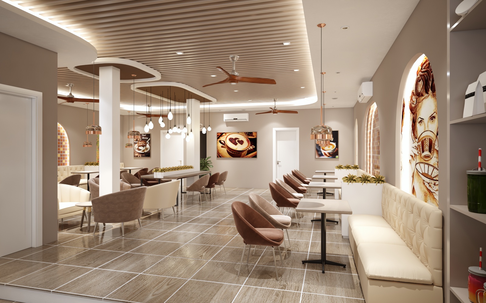 Không gian quán được phối theo quy tắc màu sắc 6-3-1, với 60% màu nâu đất, 20% màu kem, và 10% màu cam, giúp tạo cảm giác ấm cúng, thân thuộc và hiện đại như đang ở một nhà hàng cao cấp. Hệ thống đèn bóng và LED được tích hợp khéo léo trong không gian, tạo điểm nhấn đặc trưng cho quán cafe. Đảm bảo mọi khu vực bàn ngồi đều có ánh sáng đủ để khách hàng thư giãn.