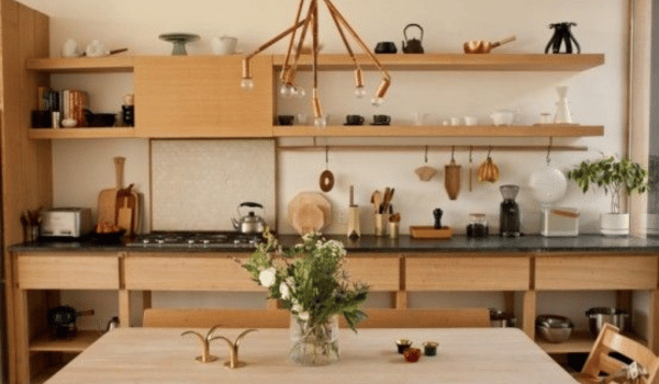 Không gian phòng bếp được sắp xếp gọn gàng, ngăn nắp theo một tư duy nhất quán, tính toán hợp lý về diện tích sử dụng. Nội thất trong gian bếp kiểu Nhật thường được làm từ gỗ, đá để đảm bảo tính bền chắc và thời gian sử dụng lâu dài.
