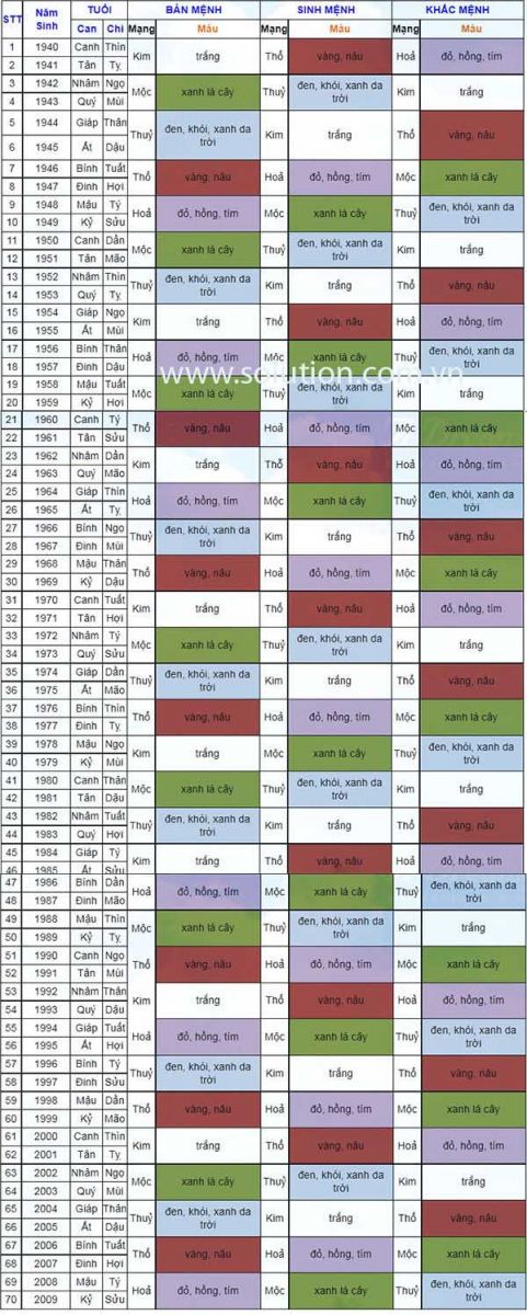 Sau khi tìm hiểu được mệnh, bạn nên tra cứu bảng ở dưới đây nhằm xác định màu sắc phù hợp với mệnh.