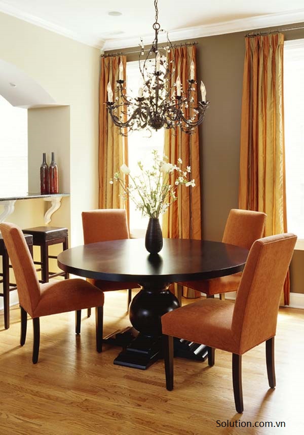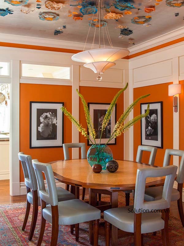 Khi lựa chọn gam màu cam để sơn tường hay sàn, để phòng ăn thêm phần sáng hơn, bạn cần kết hợp cùng màu trung tính với sắc thái nhẹ như gam màu trắng tại khung cửa, màu xám ở bàn ghế, màu be sàn gỗ … hoặc điểm nhấn gam màu đen trong căn phòng với diện tích lớn.