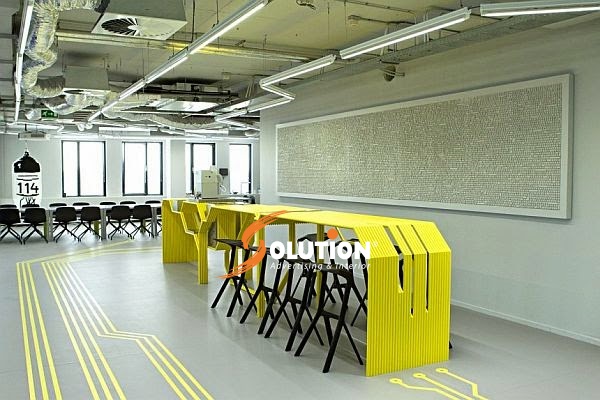 Để tạo ra được nơi làm việc hấp dẫn, có sử dụng các vật liệu hiện đại, tiên tiến và âm thanh thú vị như huỳnh quang chiếu sáng LED đặt song song với máy in trên sàn như tuyến đường bộ chạy khắp mọi cấp và giường ghế couche từ chất liệu xốp mềm, màu xanh cắm mở rộng.