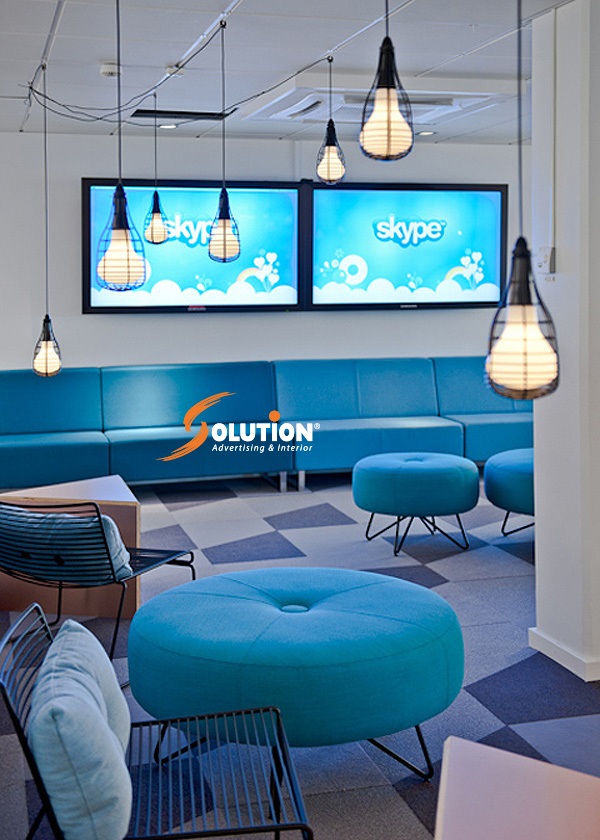 Văn phòng Skype là không gian nội thất sắc màu đa dạng, ấn tượng và sinh động. Từ việc trải thảm đến màu sắc của các bức tường tới sản phẩm đồ nội thất văn phòng hiện đại đều mang tới sắc thái riêng của nền văn hóa ở trên thế giới sáng tạo và độc đáo.