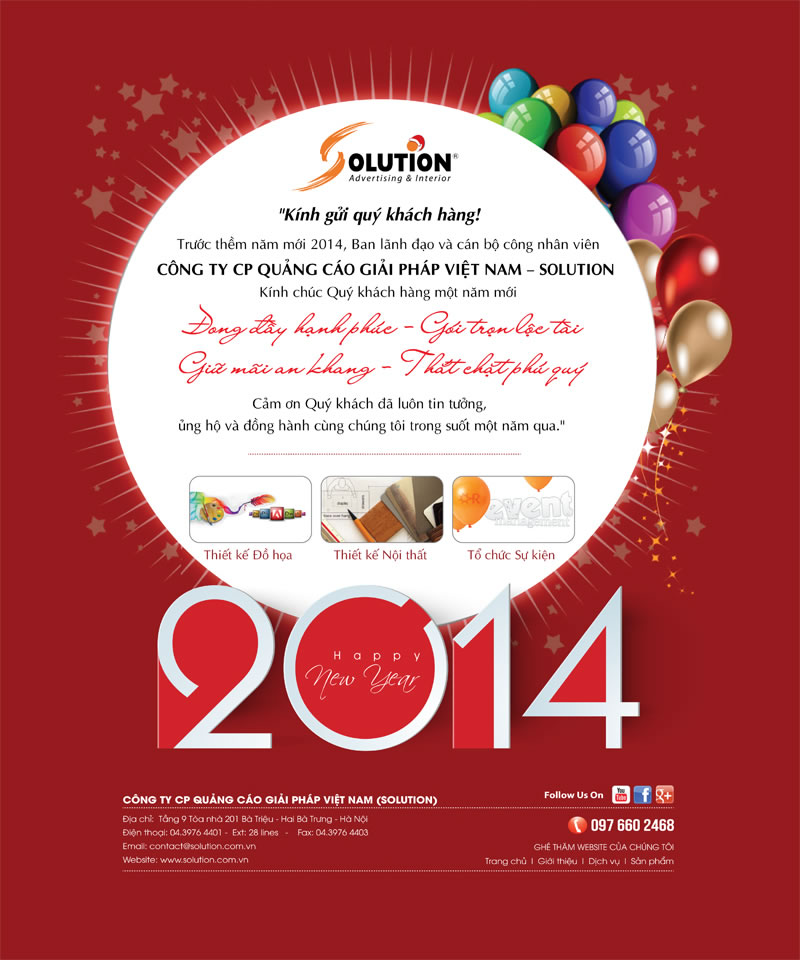 Công ty tổ chức sự kiện Solution xin gửi lời cảm ơn và lời chúc mừng năm mới tới Quý khách hàng đã gắn bó với Solution từ khi được thành lập tới nay!